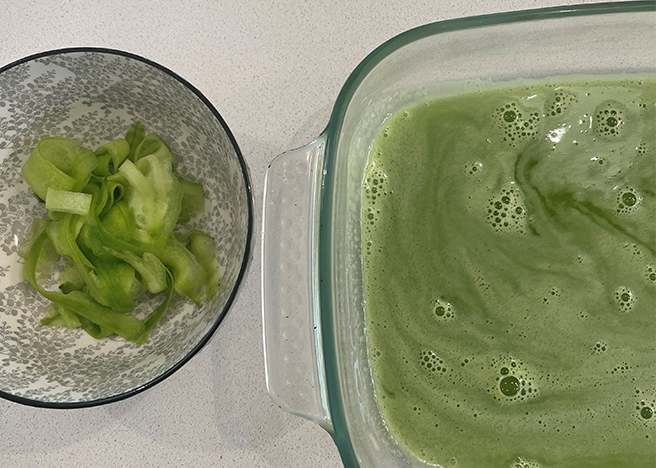 Combine the Riesling, sugar, lime juice and cucumber juice is a baking dish.