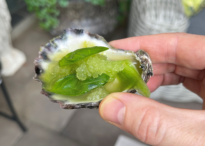 Spoon the granita over the oysters and garnish with the cucumber peel and fresh basil. Serve immediately.